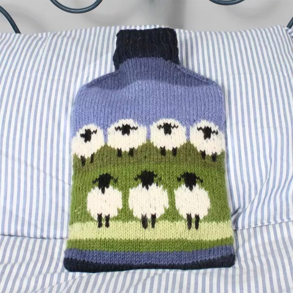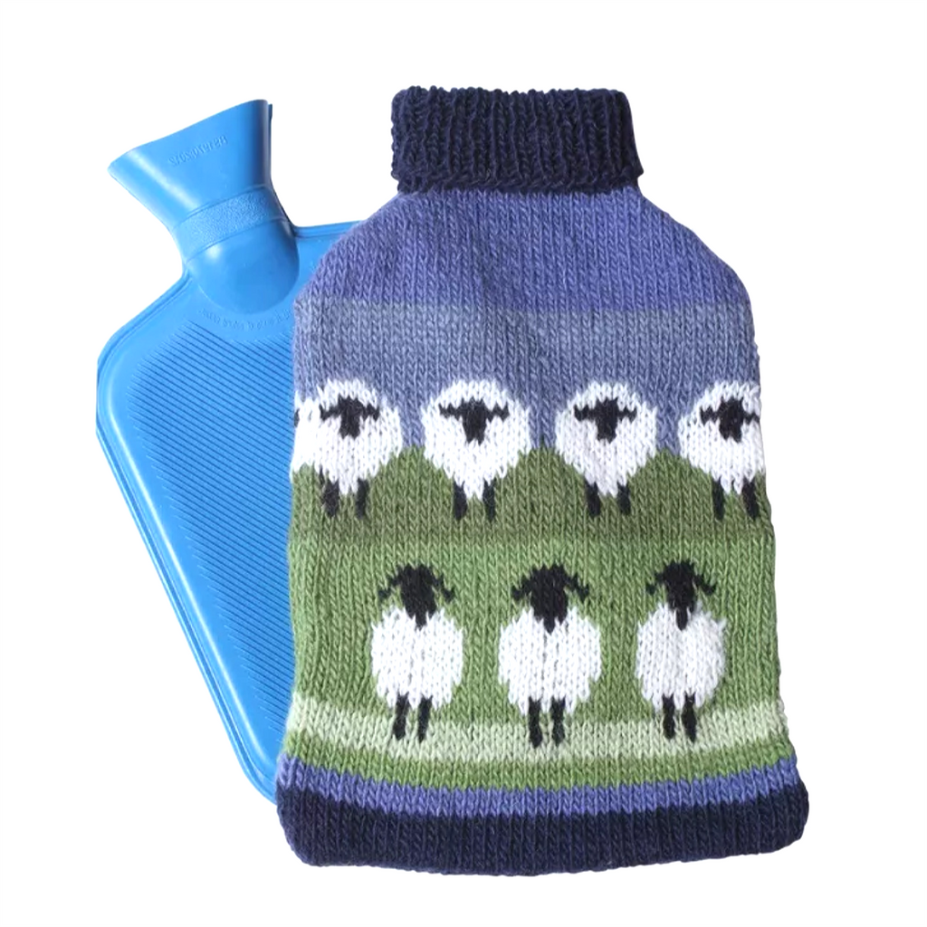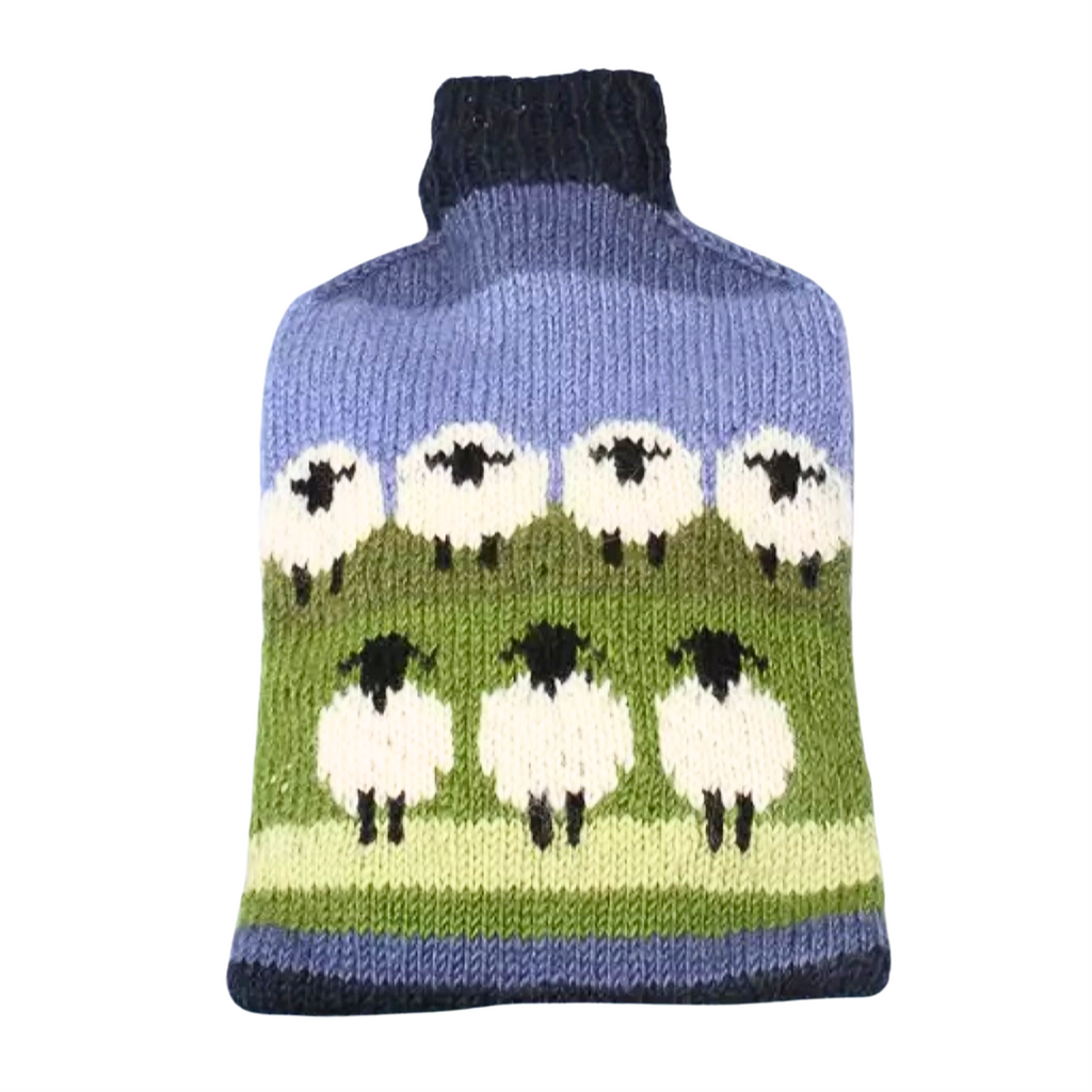 Pachamama 'Flock Of Sheep' Design Chunky Knit Wool Hot Water Bottle Cover, with bottle