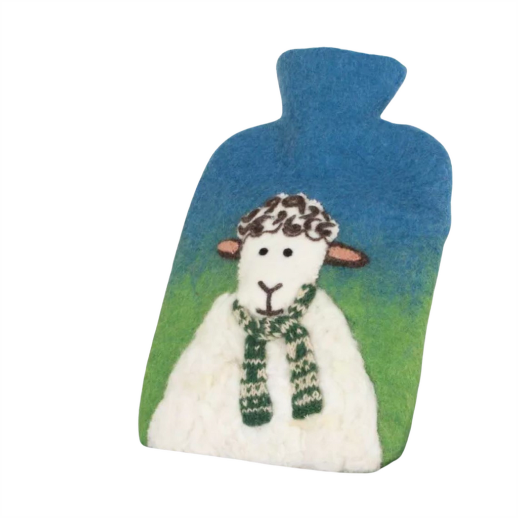 What do we love about sheep? Everything! Cosy up with our hand felted hot water bottle with quirky Sheep design. Cover 100% wool with coconut button fastening. Fair Trade and Handmade in Nepal. Comes with 2L hot water bottle (100% rubber with plastic stopper).