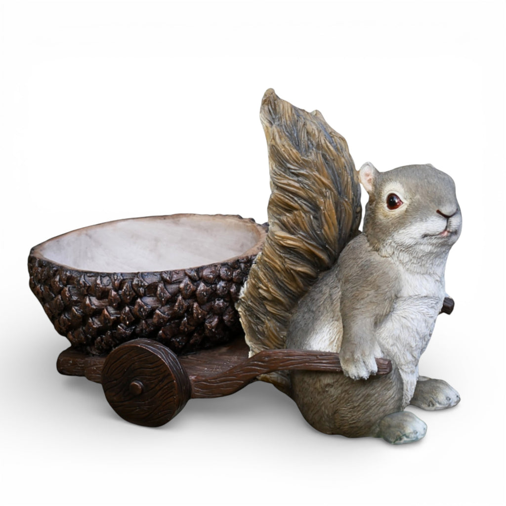 Meet your garden's new best friend! This playful squirrel ornament comes complete with an acorn-shaped trailer, creating a charming woodland scene that'll make you smile every time you spot it. With those adorable brown eyes and realistic acorn detailing, this little character is bursting with personality. Measuring 28cm, it's the ideal size for garden displays or indoor shelves. Built from sturdy resin, it handles both outdoor elements and cosy indoor corners with ease. The squirrel and trailer are bonded as one delightful piece, ready to become a treasured part of your quirky garden collection.