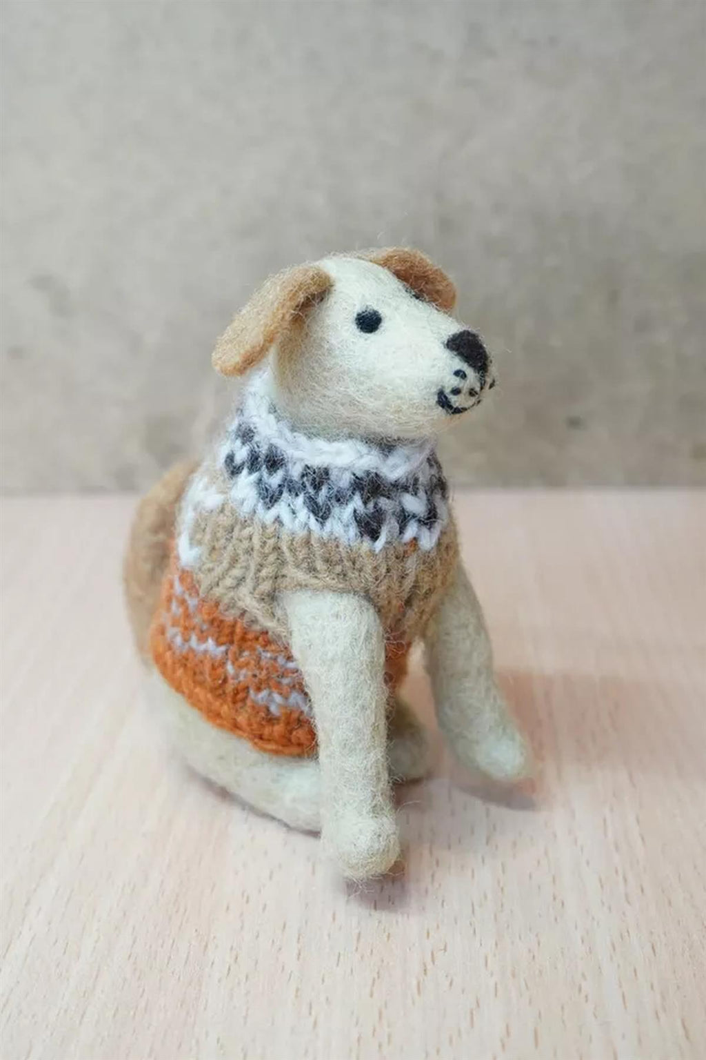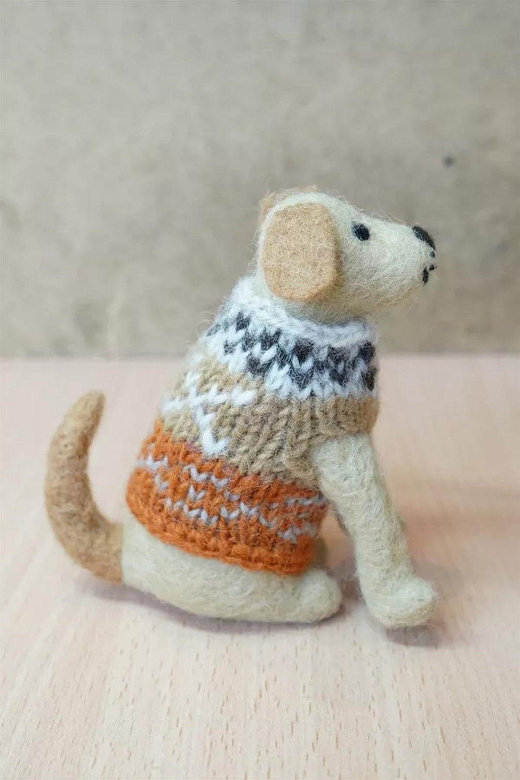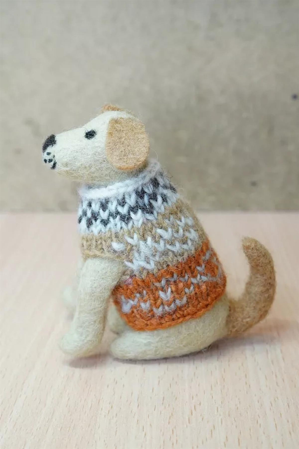 Laura the Labrador Dog is feeling a little chilly and is sporting her favourite fair isle tank top! Approx 10cm tall Hand felted wool home ornament, cute animal design. Felt Dog Decoration. A perfect gift for Lab owners and dog lovers! Fair Trade & Handmade in Nepal. Crafted by hand with Felt Wool Please note our decorations are not intended to be used as a toy. Not suitable for children under 36 months due to small parts. Fair Trade and Handmade in Nepal